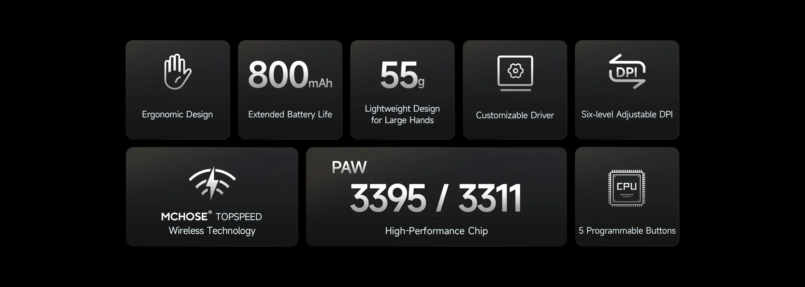 The G7 is powered by MCHOSE TOPSPEED wireless technology, offering ultra-fast response times and pinpoint precision for unmatched control. With high-efficiency data transmission, you’ll experience a smooth, lag-free connection that keeps you in the zone—whether you’re crushing deadlines or conquering your favorite games.