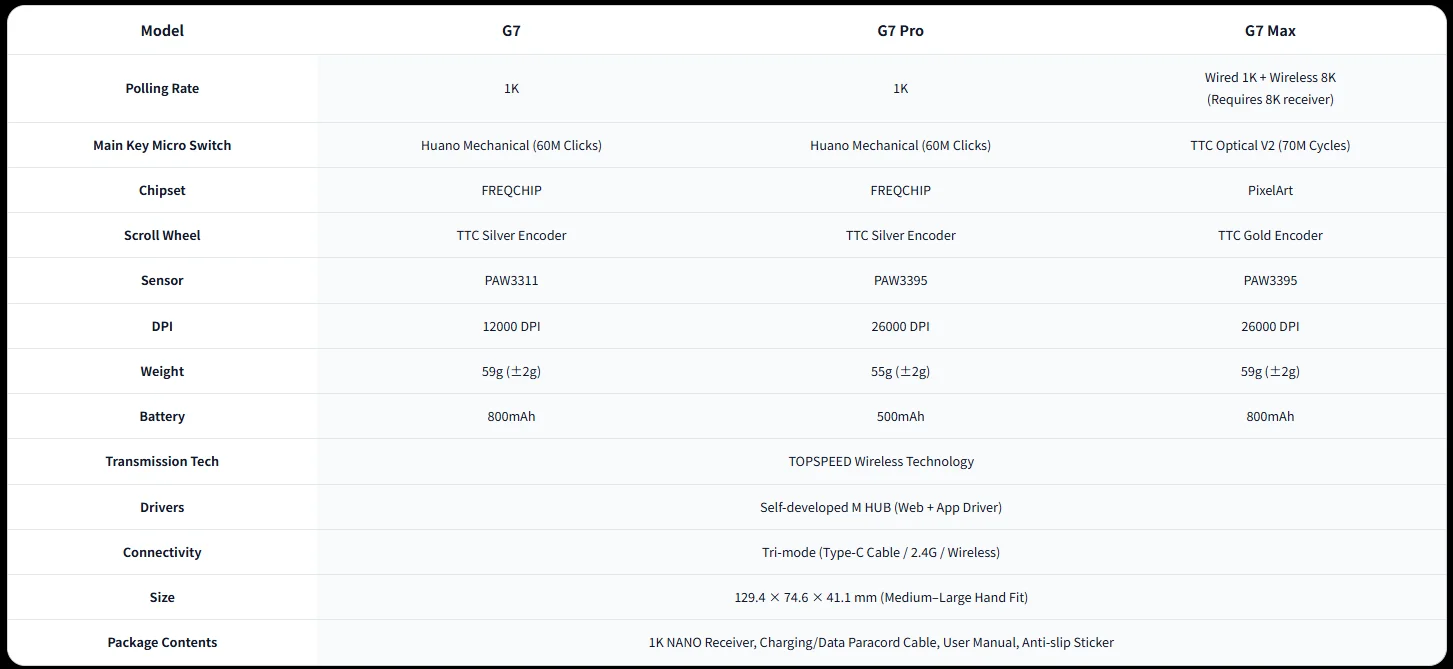 Weighing only 55g, the G7 is designed for ultimate comfort and effortless control. Its lightweight build lets you glide through tasks with ease, providing precision and responsiveness while reducing hand fatigue, making it perfect for both gaming and work.