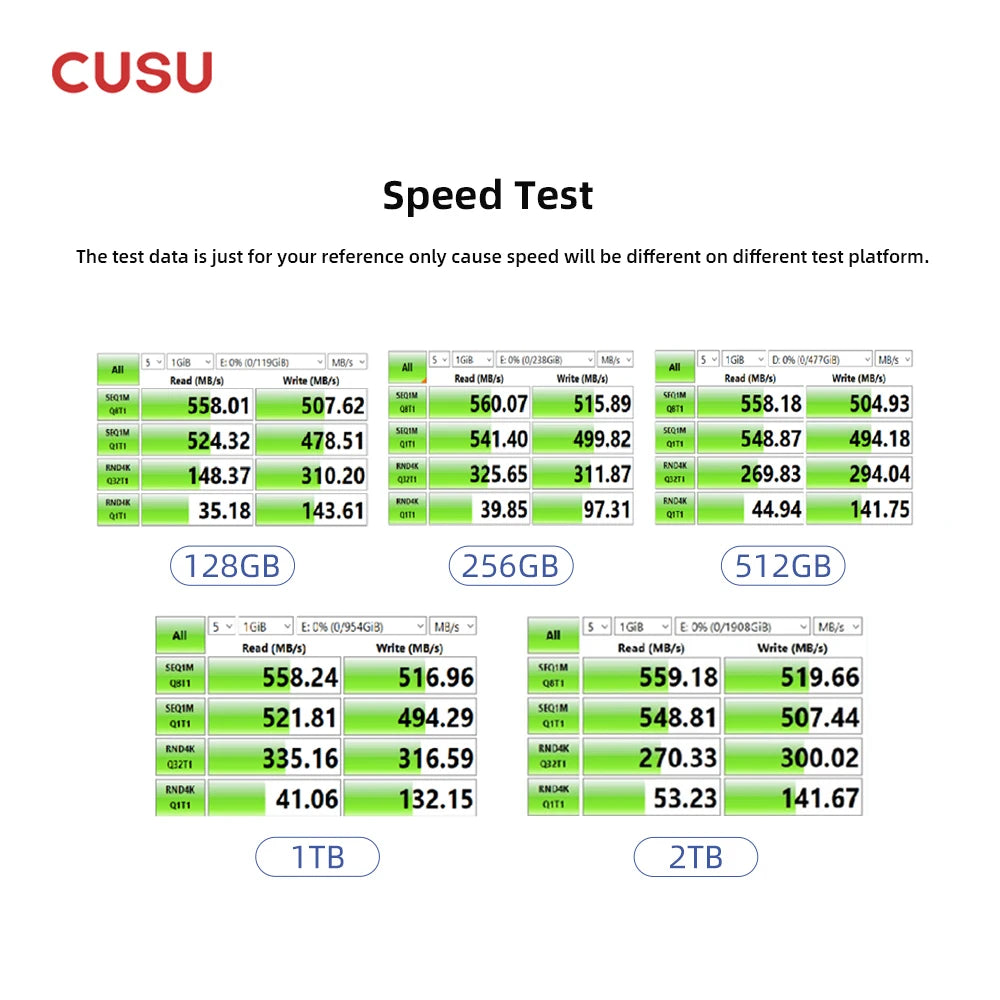 The speed is just for your reference, SSD speed will be influenced by many factors, such as  interface type, computer hardware grade, computer system, and test system.