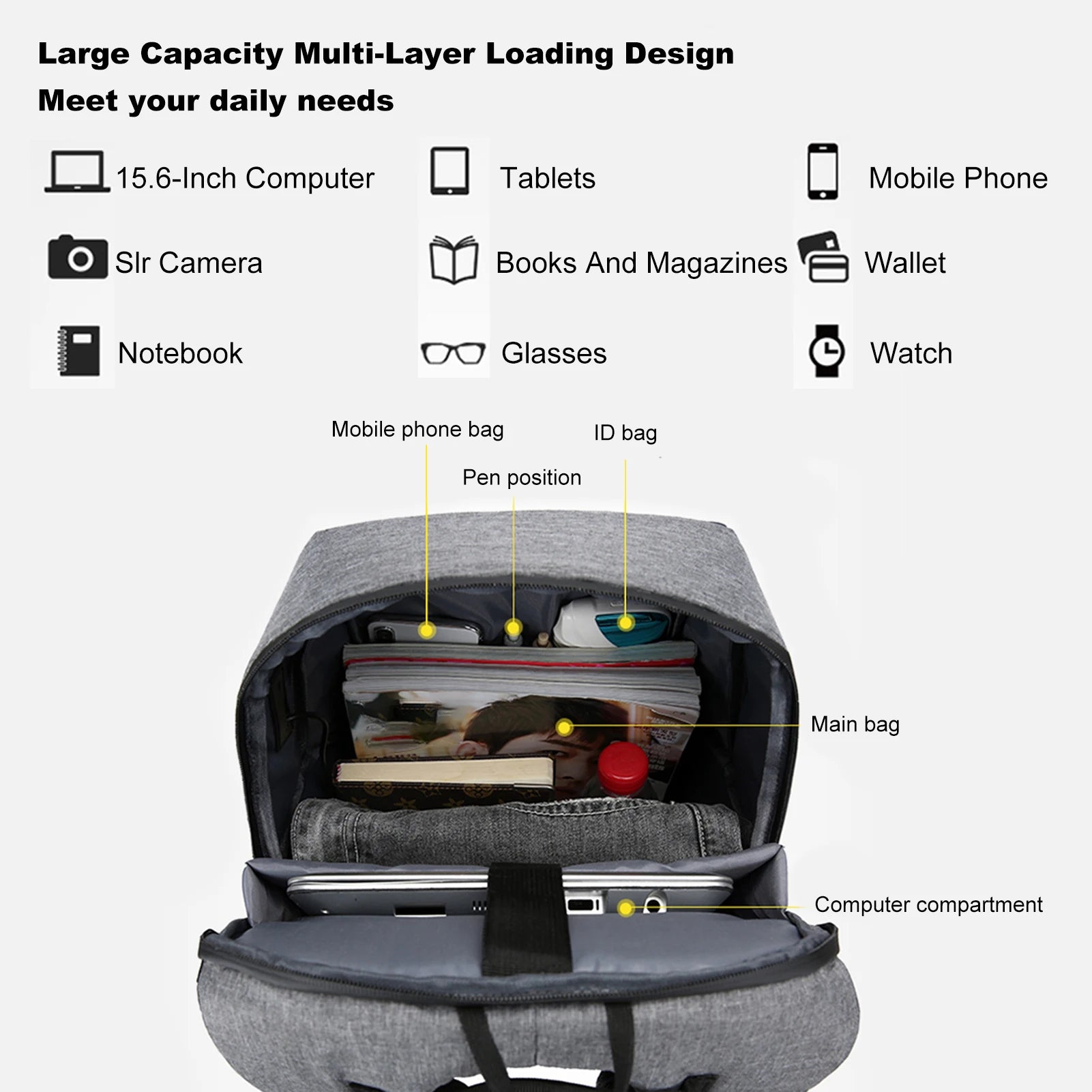 This large-capacity backpack with USB charger is made of high-elastic polyester Oxford fabric, water-repellent design, and internal multi-layer loading design, which can accommodate daily items such as 17in computers, SLR cameras, tablets, etc.