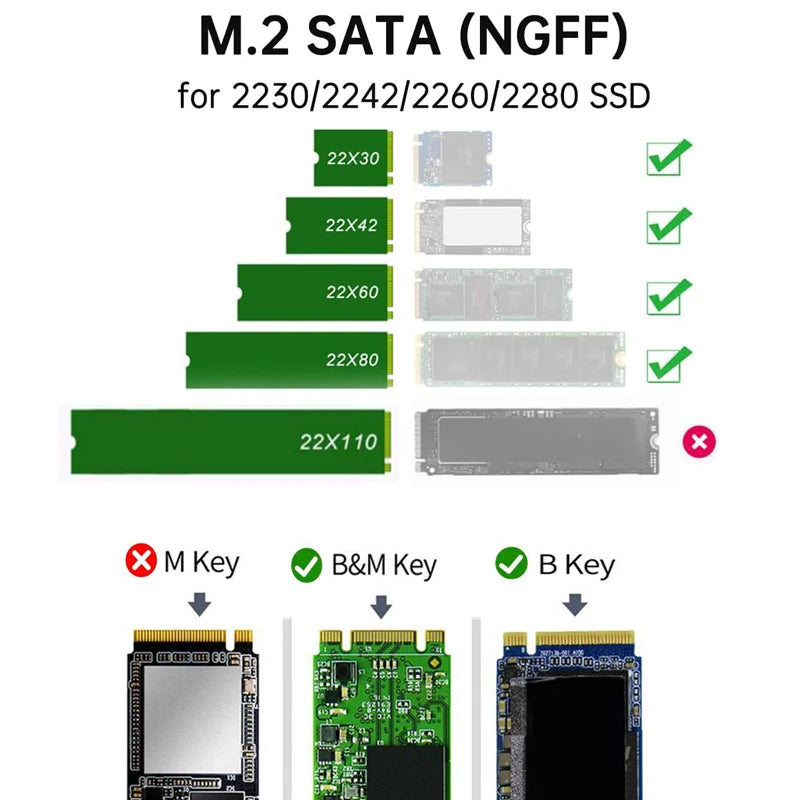 Compatibility: M.2 SATA B Key & (B+M) Key 2280/2260/2242/2230 SSD