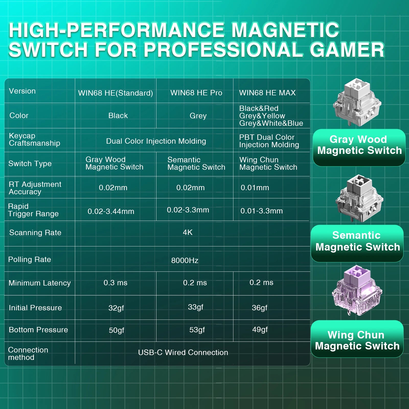 With WIN60 HE,WIN68 HE Wing chun, switches,you can experience unparalleled response time, it's designed for rapid trigger actions in competitive gaming.