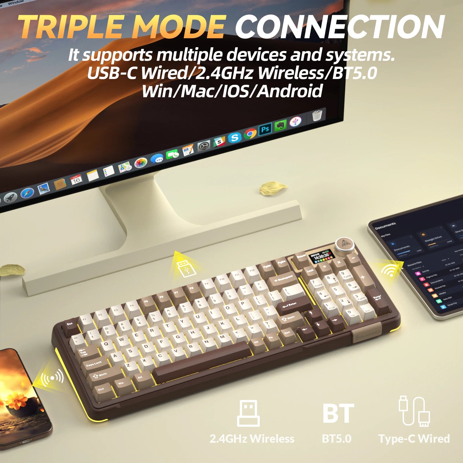 The SOLAKAKA A99 Pro is more than a tool; it's your intelligent partner for work and play. From its versatile triple-mode connection and durable PBT build to its silky-smooth switches, smart display, and multi-functional knob—every detail is meticulously designed to deliver a flawless and personalized typing experience.