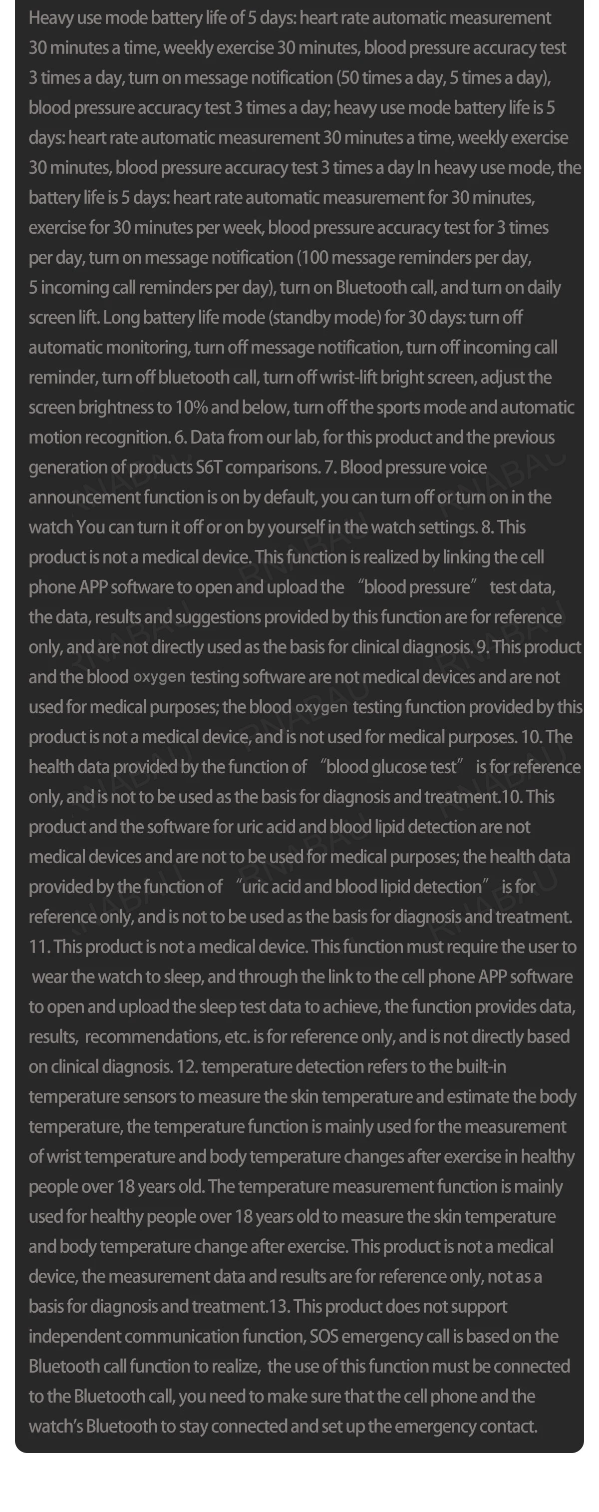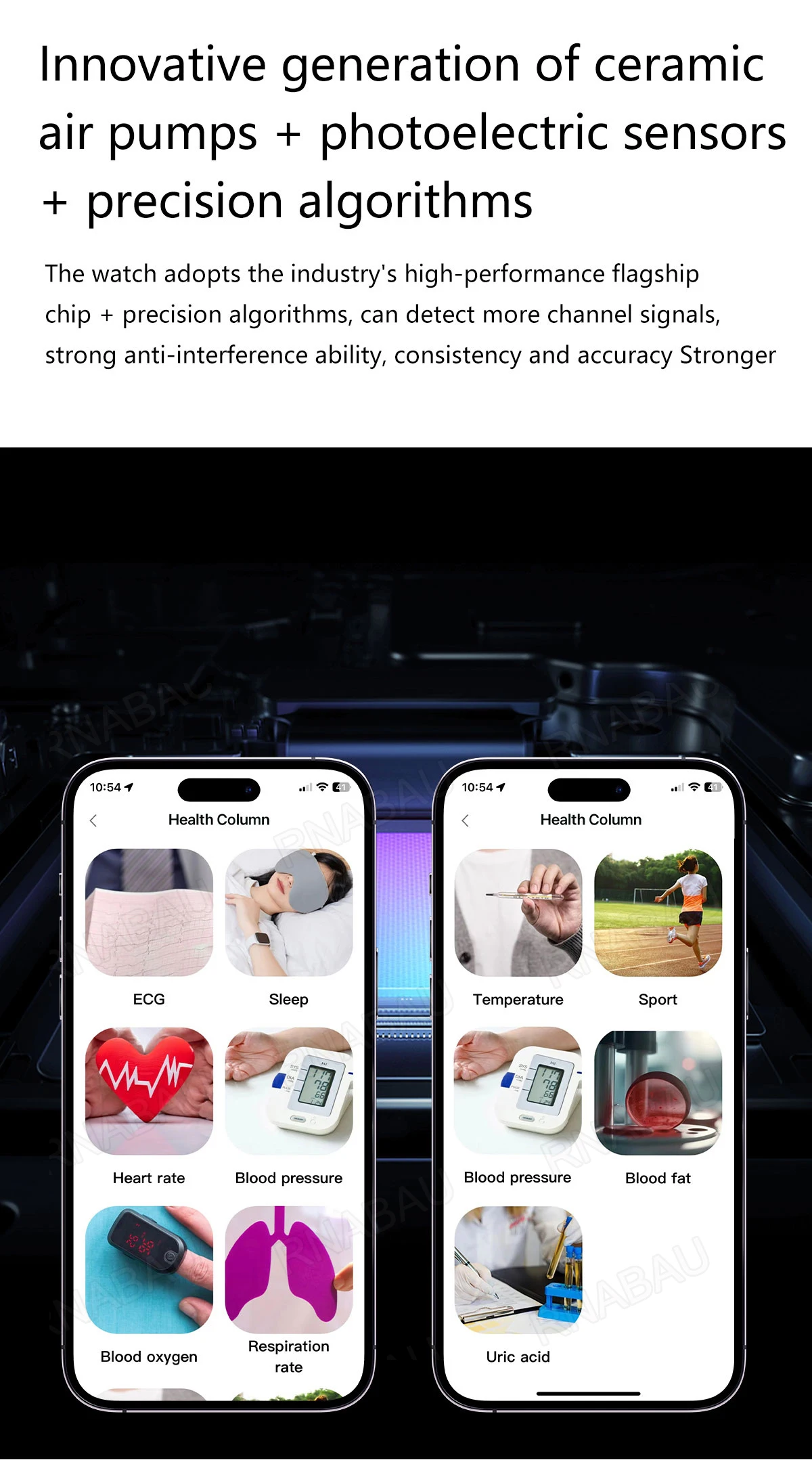 1.43-inch AMOLED retina touch screen,Air pump + airbag type real blood pressure accurate test, blood pressure voice broadcast, TPU ultra-thin comfortable airbag (removable), ECG electrocardiogram, AI intelligent diagnosis, blood monitoring, uric acid monitoring, blood lipid monitoring, body temperature monitoring, blood oxygen monitoring, respiratory rate, sleep monitoring, sedentary reminder and other health management functions.