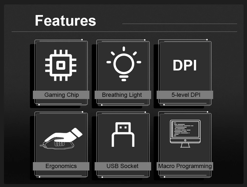 Acme adjustable DPI to 24000-equipped with 5 onboard DPI levels (400/800/1600/2400/3200), can accurately position the mouse movement. Each of the 5 DPI levels can be easily customized via software, allowing you to quickly switch to DPI settings.