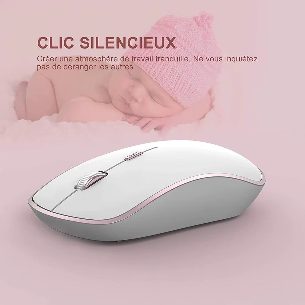 French Keyboard Wireless 2400DPI Mouse 2.4Ghz Ultra-Slim AZERTY Keyboard Mouse Set, Portable Silent Ergonomic Keyboard and Mouse - Pink/White Silver