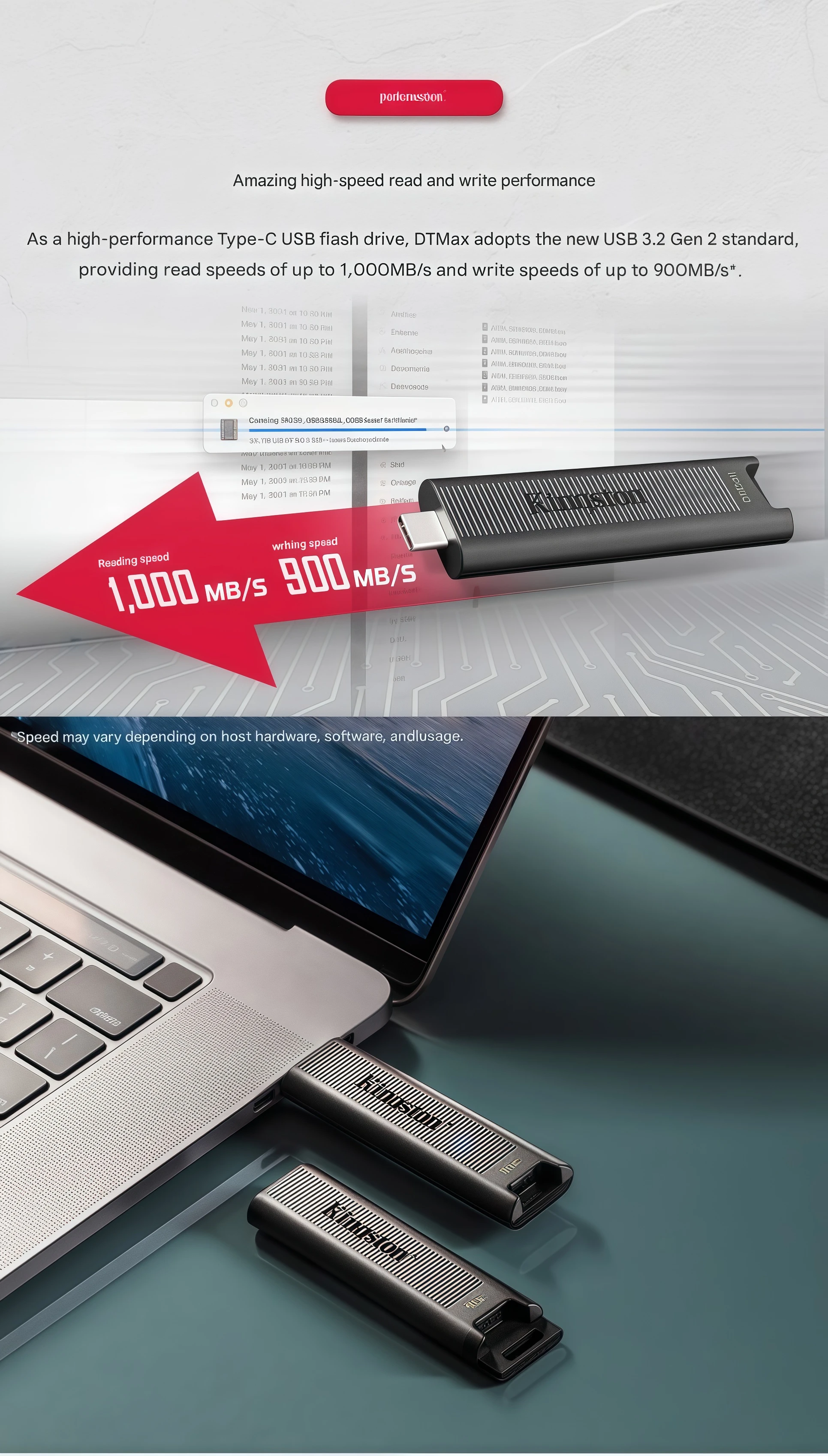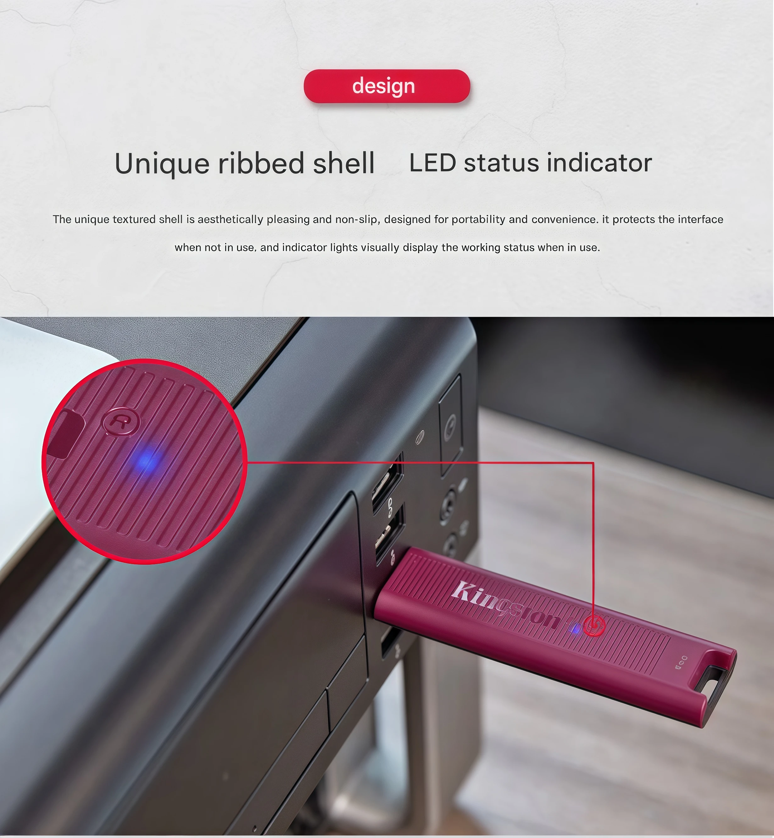 Kingston’s DataTraveler Max series USB flash drives leverage the latest USB 3.2 Gen 2 standard to deliver record-breaking read/write speeds up to 1,000/900MB/s. Designed with portability and convenience in mind, the unique ridged casing protects the connector when not in use and is easily moved with a single motion. Available in USB Type-C and Type-A connections to support next-gen and traditional laptops and desktops. The DT Max series delivers premium performance and expanded capacities up to 1TB3 making them the ideal solution for transferring and storing large digital files such as HD photos, 4K/8K videos, music and more.